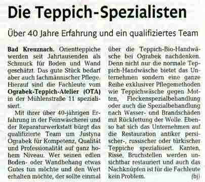Die Teppich-SpezialistenBeitrags-Kategorie:TippsÖffentlicher Anzeiger-Rhein Zeitung – 20.10.2011 Das könnte dir auch gefallen Persönliche Danksagung an uns 20 Januar 2019 Reinigung kostbarer Kirchenteppiche 8 September 2019 Ausstellung bietet Einblick in die alte Teppichkunst 1 Februar 2017