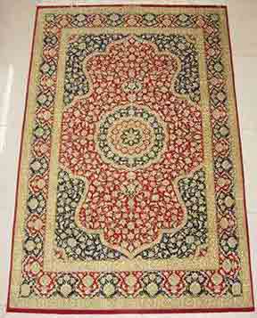 Die alte heilige Stadt Kum in Mittelpersien ist Herstellungsort einer der besten Teppicharten der Neuzeit. Helle, sehr freundliche Teppiche und Brücken mit mannigfaltigen klaren, floralen Mustern in besonderer Feinheit werden hier geknüpft. Der dichte, glattgeschorene, mittelhohe Flor besteht aus fester Wolle mit mattem Glanz. Mit ihrem Grundgewebe aus dünngezwirnten Baumwollfäden haben die Ghums eine lederstarke aber biegsame Struktur. Fortlaufend gerichtete Muster, versetzt angeordneter Botah-Motive und verschiedener Pflanzenmotive in unendlichem Rapport überwiegen; aber auch geometrische Feldeinteilungen durch Rautung und Quadrierung sind zu finden. In Längsrichtung verlaufende Parallelbahnen werden ebenfalls bevorzugt. Es kommen auch, allerdings seltener, Medaillongliederungen mit Rankenwerk vor. Versetzt angereihte zierliche Vasen mit Blumensträußen und kleinen Vögeln muten an wie die Dekors von Biedermeier-Porzellan. Gitterartig angeordnete Blüten- und Blattarabesken erinnern an die Muster der alten Seldschuken-Teppiche. In der Feldeinteilung sehen wir Trauerweiden, Blütenstauden, Botah-Motive und kleine Gebetnischen als Füllung.