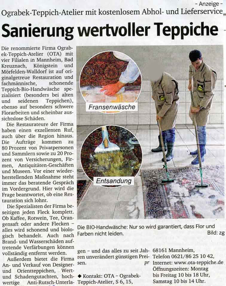 Sanierung wertvoller TeppicheBeitrags-Kategorie:TippsSanierung wertvoller TeppicheMannheimer Morgen – 14.11.2010Die Restaurateure der Firma haben einen exzellenten Ruf, auch über die Region hinaus. Das könnte dir auch gefallen Junge Chinesin knüpft ungewöhnlichen Teppich 1 Februar 2017 TEILNAHME AN MESSEN 8 September 2019 Ausstellung bietet Einblick in die alte Teppichkunst 1 Februar 2017