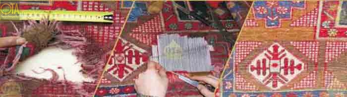 Alte natürlich gefärbte Wolle gewinnen wir aus ausrangierten Flachgeweben, die wir sorgfältig auftrennen und anschließend waschen. Sie hat den Vorteil, dass sich ihr Farbwert nicht nachträglich verändert. Es besteht somit keine Gefahr, dass die Flickstelle durch eine nachträgliche Farbveränderung sichtbar werden könnte. Falls trotz unser großen Auswahl die passenden Materialien fehlen, färben wir die Materialien speziell ein. Bei der Florreparatur verwenden wir dieselbe Knüpfung wie im Teppich, so dass man die Reparatur auch von der Rückseite fast nicht erkennen kann. Am Ende einer Florrestauration schneidet der Restaurateur die eingeknüpfte Wolle bzw. Seide auf die entsprechende Florhöhe des Teppichs ab. Dabei muss er äußerst detailgetreu arbeiten und darf keinen Fehler machen, sonst ist die Reparatur zunichte.