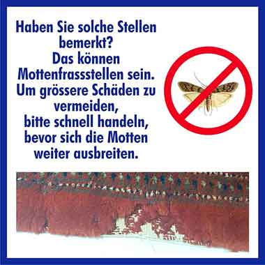 Auch die Stelle, an der der Teppich lag, sollte gründlich gesäubert und mit unserem Spezial-Mottenspray auf pflanzlicher Basis behandelt werden. Den Mottenspray können Sie über uns beziehen.